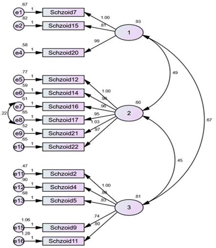 The confirmatory factor analysis (Figure 1) illustrates the three-factor structure of the Schizoid Personality Disorder Scale, confirming the relationship between the latent constructs (factors) and their observed variables (items). Each factor (labeled 1, 2, and 3) is linked to a subset of items with standardized regression weights, all exceeding the acceptable threshold.onfirmatory factor analysis ended in 14 item Schizoid Personality Disorder Scale for Adults.