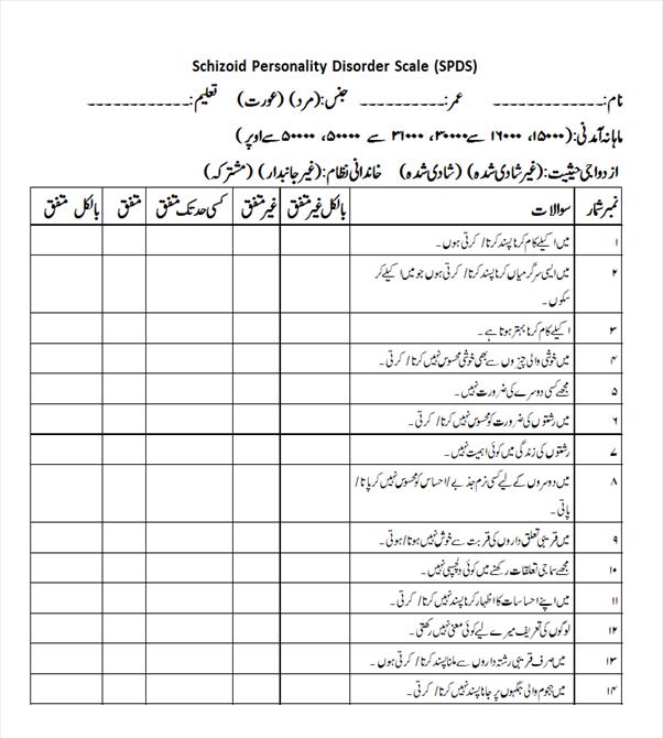 Schizoid Personality Disorder Scale (English & Urdu versions) are given as Annexures (1&2).