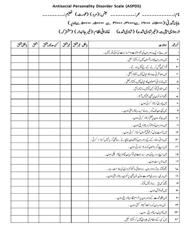 Personality disorders, including ASPD, have long been a subject of debate in psychiatry and psychology. However, understanding dysfunction requires knowledge of the normal course of personality development. Cultural differences may influence psychological assessments, as most psychological exams, including those in Pakistan, are administered in English, which could lead to misinterpretation of results due to cultural variations. Cross-cultural assessment remains a complex issue, as standardized exams applied across different cultural contexts may not accurately measure psychological constructs due to cultural influences on personality traits. The purpose of the current study was to develop an Antisocial Personality Disorder Scale for adults in the Urdu language and to evaluate its psychometric properties.