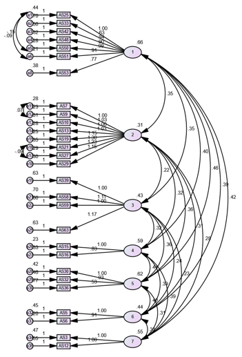 Results: EFA identified seven factors explaining 62.35% of the variance, with factor loadings ranging from 0.44 to 0.73. CFA confirmed the model fit (CFI = 0.917, RMSEA = 0.063), and the final ASPDS comprised 28 items. The scale demonstrated high internal consistency, with a Cronbach’s alpha of 0.94 and subscale reliabilities ranging from 0.67 to 0.91. Convergent validity was confirmed by a significant correlation (r =0.692, p <0.01) with the SD3 psychopathy subscale. The Kaiser-Meyer-Olkin measure was 0.93, and Bartlett’s test of sphericity was significant (p <0.001). Data were analyzed using SPSS-21 and AMOS-21.