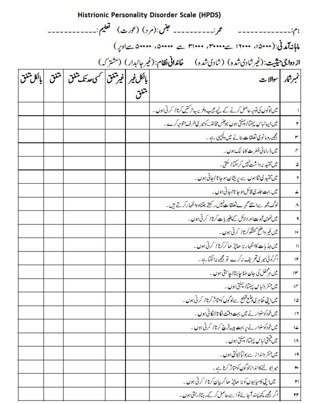 There are very few studies and measuring instruments available on histrionic personality problems and these scales are developed and validated on western societies and cultures. Due to the lake of indigenous personality measures in Urdu language, the current research will play a crucial role for the assessment of histrionic personality disorder. The objective of the current study was to develop and validate an Indigenous Histrionic Personality Disorder Scale (HPDS) for adults in the cultural context of Pakistan, and to evaluate its psychometric properties for use in clinical and non-clinical populations.