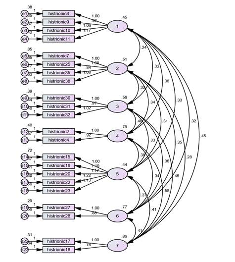 The figures of confirmatory factor analysis of Histrionic Personality Scale for Adults are depicted with seven symptomatology by removing 19 items that are listed as, 1, 3, 5, 6, 12, 13, 14, 16, 21, 24, 26, 29, 33, 34, 36, 37, 39, 40 and 41 (Table IV).
