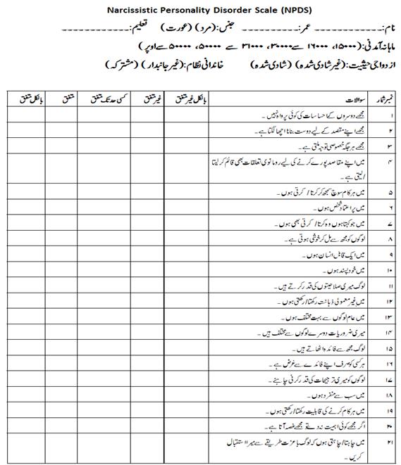 Although personality disorder assessment tools are widely available globally, indigenous tools tailored to the local context are lacking in Pakistan. The diversity of languages in Pakistan poses additional challenges, as not everyone is proficient in English, making it difficult for many to comprehend or communicate effectively. Thus, there was a pressing need to develop an Urdu-language tool to address cultural, linguistic, and comprehension barriers in assessing NPD among Pakistani adults. This self-report measure, constructed in Pakistan’s national language, is designed to be accessible not only to researchers and clinicians but also to laypersons.