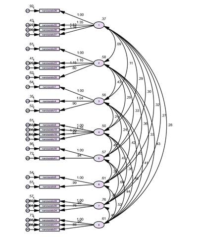 Item number 26, 35, 36, 37 were found to be reliable for the factor I. Further, 20, 23, 24, 28 number items were considered reliable for factor II. Item numbers 1, 4, 12 were found reliable for factor III. The item numbers 8, 15, 16, 18 were confirmed to be reliable for factor IV. Additionally, at factor V the item numbers 38, 41 were reliable. The item numbers 6, 9 were confirmed to be reliable for factor VI and item number 29, 30, 34 were included in factor VII. Finally, item number 14, 17, 31 were found reliable for factor VIII. Figure 1 depicts the pictorial explanation of confirmatory factor analysis of narcissistc personality disorder scale.