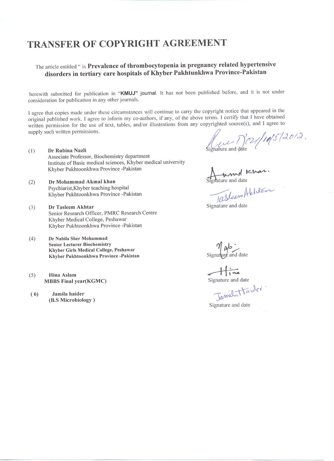 Conclusion: A high frequency of thrombocytopenia was recorded in the patients with pregnancy related hypertensivedisorders in the tertiary care hospitals of Peshawar. The severity of thrombocytopenia is proportional to the severity ofpregnancy related hypertensive disorders.