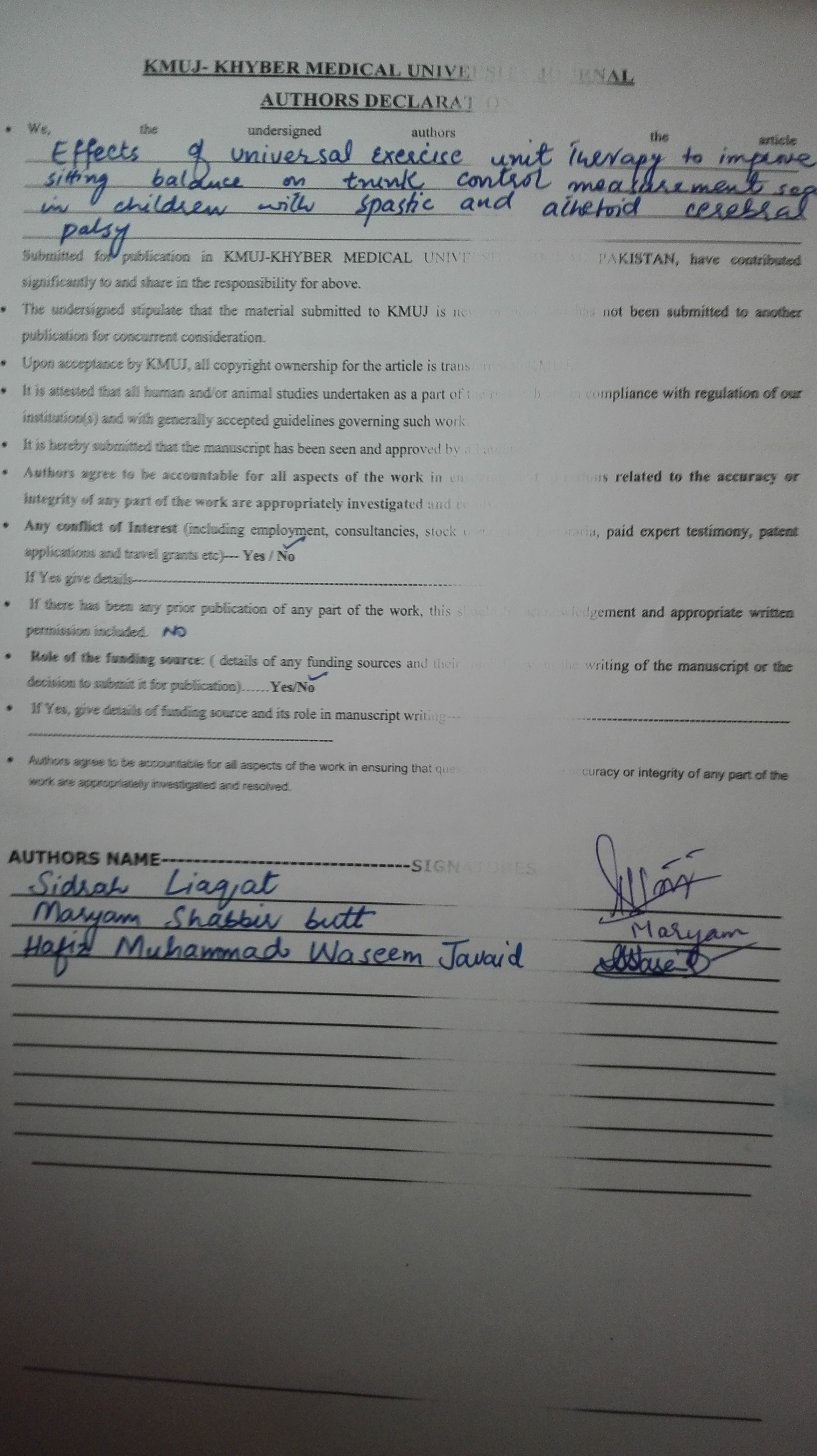 EFFECTS OF UNIVERSAL EXERCISE UNIT THERAPY ON SITTING BALANCE IN CHILDREN WITH SPASTIC AND ATHETOID CEREBRAL PALSY: A QUASI-EXPERIMENTAL STUDY