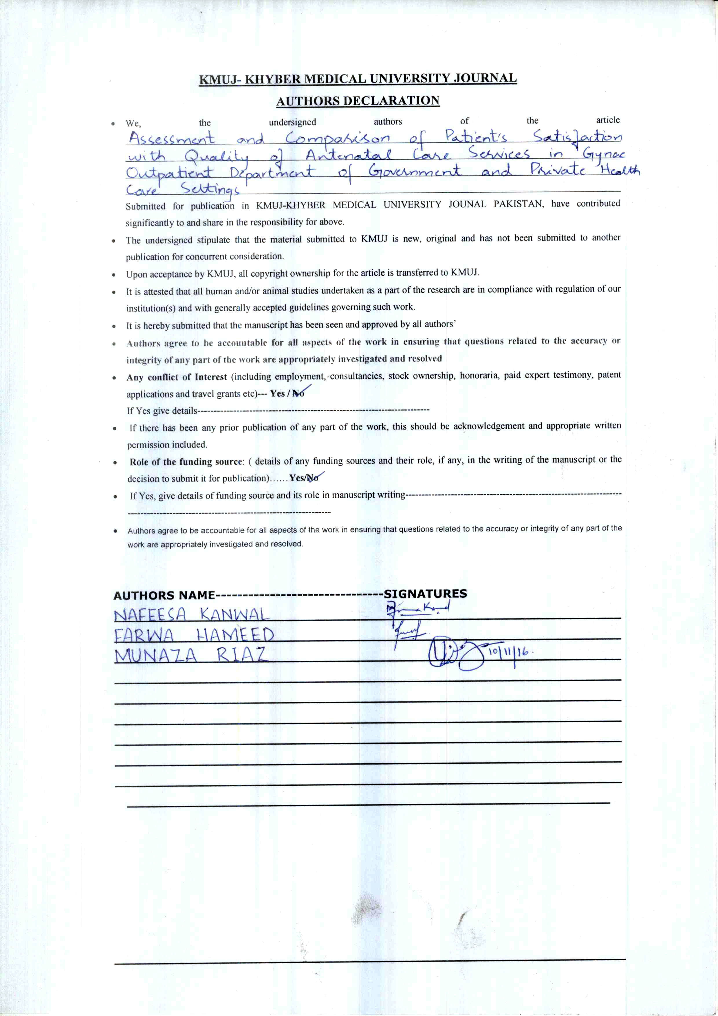 ASSESSMENT AND COMPARISON OF PATIENT’S SATISFACTION WITH QUALITY OF ANTENATAL CARE SERVICES IN GYNAE OUTPATIENT DEPARTMENT OF GOVERNMENT AND PRIVATE HEALTH CARE SETTINGS