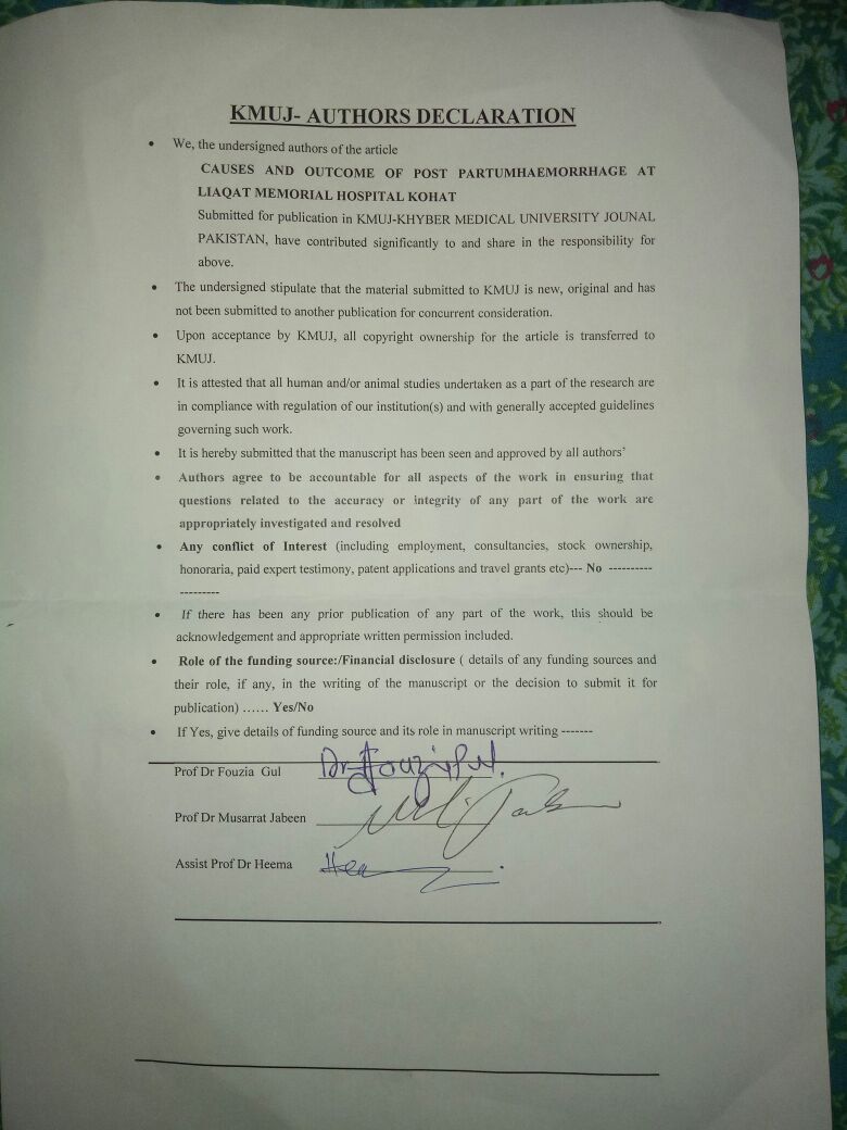 FREQUENCY, CAUSES AND OUTCOME OF POST PARTUM HAEMORRHAGE AT LIAQAT MEMORIAL HOSPITAL KOHAT, PAKISTAN