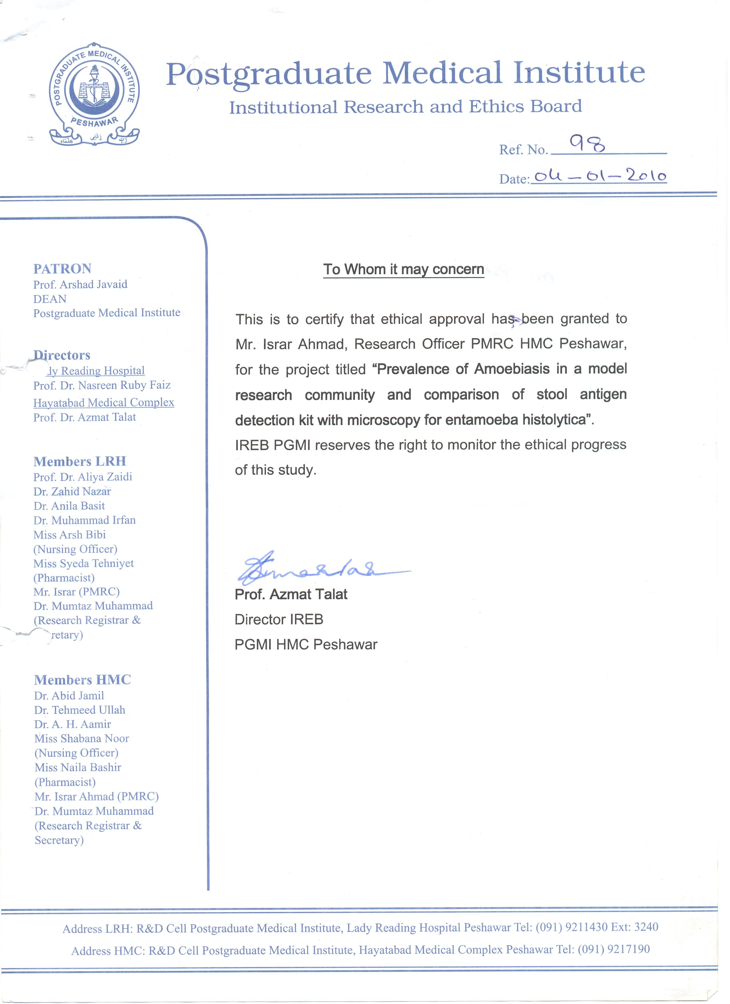 Ali AM, Masud T, Arif S. Frequency of parasitic infestation in faecal specimens. J Ayub Med Coll Abbottabad 2014 Jan-Mar; 26(1):49-51.