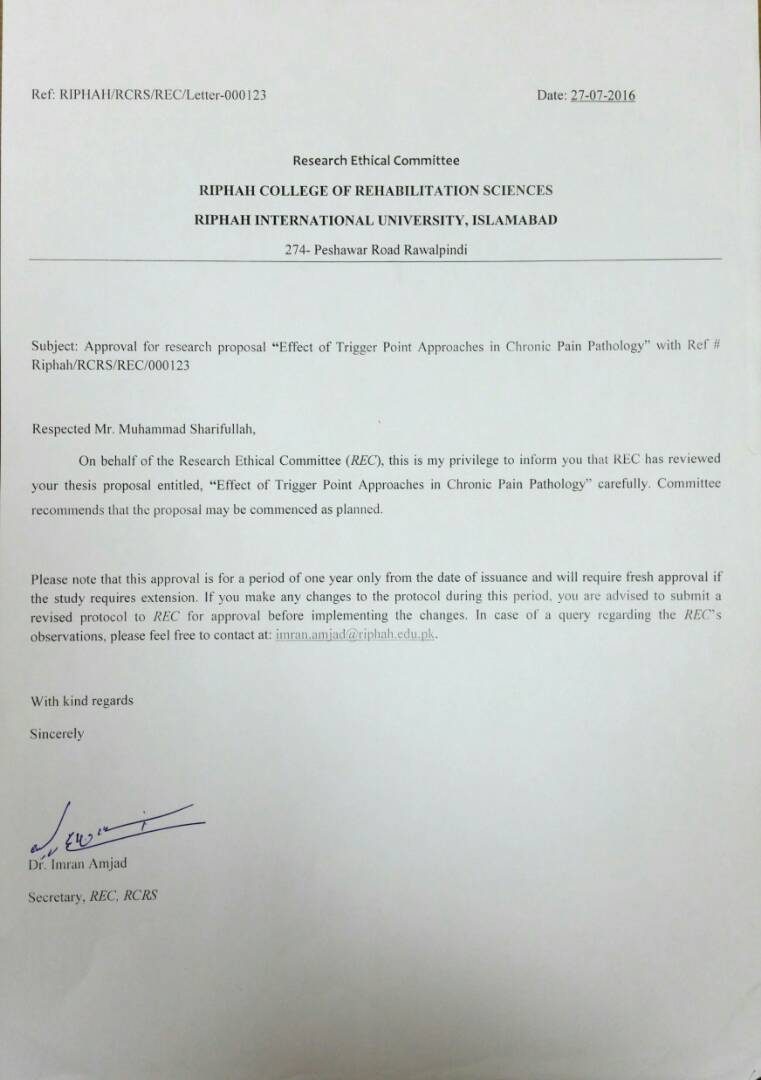 METHODS: This randomized controlled trial was conducted in Railway General Hospital, Rawalpindi, Pakistan from July-December 2016. Patients were randomly divided into two treatment groups through lottery method, in which 37 male participants who full filled the inclusion criteria (persistent pain >6 months, gradual onset of pain and impaired level of activity) were randomly allocated to sustained pressure (Group A) and ischemic compression (Group B) treated groups. Both groups received eight treatments sessions. They were evaluated at baseline and after 8th visit through Numeric Pain Rating Scale (NPRS) and Chronic Pain Acceptance Questionnaire (CPAQ).