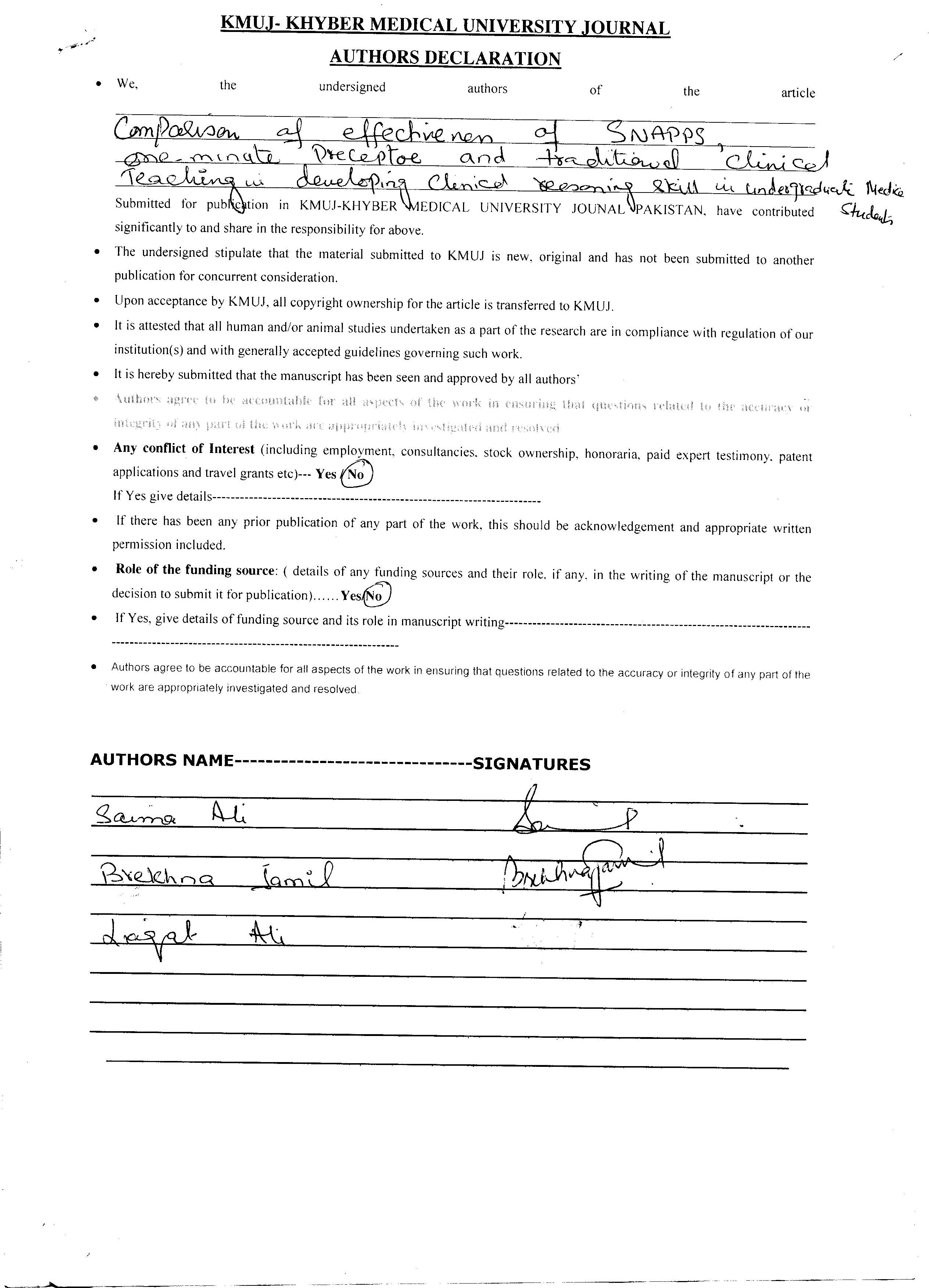OBJECTIVE: To compare the effectiveness of “summarize, narrow, analyze, probing, management plan, select a topic” (SNAPPS) model, one-minute preceptor (OMP) and traditional clinical teaching in developing clinical reasoning skills of final year undergraduate female medical students in pediatrics clinical setting.